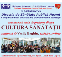 Biblioteca Județeană „G.T. Kirileanu“ Neamț, în parteneriat cu Direcția de Sănătate Publică (DSP) Neamț, prin Compartimentul de Evaluare și Promovare a Sănătății, reia găzduirea întâlnirilor din cadrul proiectului „Cultura Sănătății“,